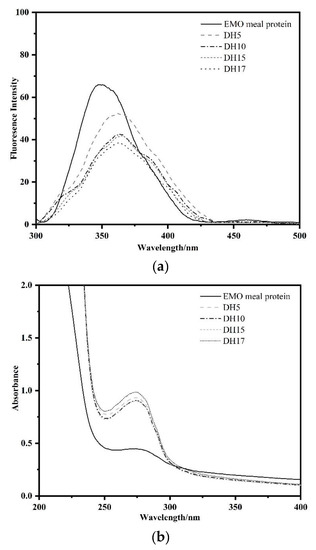The intrinsic fluorescence and UV spectra can be used to determine the exposure of protein aromatic amino acids (tryptophan, tyrosine and phenylalanine) to water, and this is linked to changes in protein tertiary conformation [8]. Figure 4a shows the intrinsic fluorescence spectra of various enzymatic hydrolysates. The maximum emission fluorescence wavelength (λmax) of EMO meal protein was at 350 nm, suggesting the characteristic fluorescence profile of tryptophan residues. Compared with EMO meal protein, the λmax of hydrolysates exhibited a red-shift to 356.5, 362, 362, 362.5 nm for DH5, DH10, DH15, DH17, respectively, which demonstrated that more aromatic amino acids of EMO meal protein were recognized and hydrolyzed by alcalase. The redshift also indicated that the movement of the tryptophan micro-environment in a hydrophilic direction, and the structure of the hydrolysates was more flexible [2]. In addition, the fluorescence intensity of hydrolysates was weaker than EMO meal protein, and the fluorescence intensity decreased with the increase of DH. According to previous studies, the hydrophobic groups were gradually reburied in the internal structure of the protein via hydrophobic interactions with the increase of DH, resulting in the decrease of fluorescence intensity [8,28,29]. Thus, the downward trend of the fluorescence intensity demonstrated that the hydrophilic groups were gradually exposed to the surface of hydrolysates after alcalase treatment, which was in agreement with the results of H0.