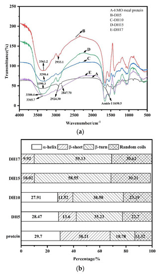 FTIR spectroscopy is a reliable method for estimating the secondary structure of protein [16]. In the present study, FTIR was used to further examine the physicochemical changes and conformational properties of protein, and the results are shown in Figure 5a. Compared to EMO meal protein, the absorption peak of hydrolysate moved gradually to a lower band with the increase of DH, indicating that the protein structure was changed after alcalase treatment. Previous studies had shown that the characteristic absorption bands at 3200–3400 cm−1 and 2800–3000 cm−1 were attributed to the stretching vibration of -OH and -CH groups, respectively [31]. All samples had absorption in these bands, and the peaks and peak widths of hydrolysate were weaker than that of protein, implying that the interaction of intramolecular hydrogen bonds in hydrolysate was weakened after enzymatic hydrolysis, which may improve the solubility of hydrolysate.