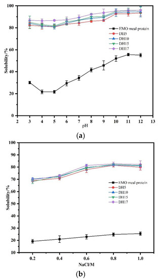 The solubility of the hydrolysates with different DH in different NaCl concentrations is shown in Figure 6b. It can be seen that the solubility of DH5-DH17 changed slightly as NaCl concentration rose from 0.2 to 0.6 mol/L, then remained stable above 0.6 mol/L. The possible explanation is that the EMO meal protein was hydrolyzed into small molecular peptides, which led to the increase of ion binding sites and repulsion, resulting in greater solubility of hydrolysate. While the NaCl concentration increased to 1 mol/L, the solubility of all samples showed a slight downward trend, which may be due to the salting out effect.