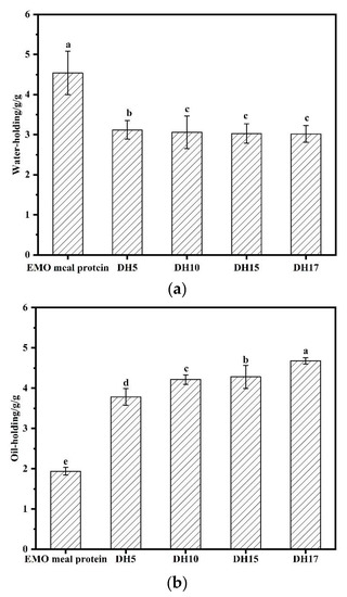 Water-holding capacity (a) and oil-holding capacity (b) of the EMO meal protein and hydrolysates with different DH. The value of different superscript letters indicated significant difference (p < 0.05).