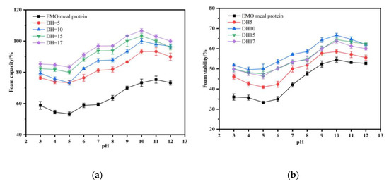 Protein foam is formed by rearrangement and absorption at the air-water interface during whipping [2]. The effect of different pH values on the foaming properties of hydrolysates is shown in Figure 8a,b. The results indicated that the changes of pH significantly affected FC and FS of the EMO protein and hydrolysates, and the FC and FS of hydrolysates were greater than that of the EMO protein at all given pH values. The minimum value of FC and FS was observed at pH 5.0 for both protein and hydrolysates, the lowest protein solubility was observed at this pH. FC and FS increased greatly when the conditions deviated from pH 5.0, showing the similar trend of solubility change at the range of pH 5.0–12.0, which suggested a strong correlation between foaming properties and solubility. A similar observation was reported by Los, Demiate, Prestes and Lamsal (2020) who investigated the foaming properties of hydrolyzed Carioca bean protein [33]. The foaming characteristics were dependent on the electrical charges on the surface of the proteins, and this also influenced solubility. In the process of increasing pH from 5 to 10, the net charge of protein increased, resulting in the decrease of hydrophobic interaction and increase of solubility. This was conductive to the expansion the protein structure, leading to an increase in the accelerated propagation of protein at the air-water interface, which promoted the improvement of foam formation. In addition, the molecular weight and S-S content of protein were reduced by enzymatic hydrolysis, leading to more flexible peptide chains and a high diffusion rate, which was conducive to the improvement of FC [1]. Moreover, the FC of hydrolysate showed a rising trend with the increase of DH, accompanying the hydrolysate of DH17 had the highest value of 75.33% at pH = 11. However, the maximum FS was observed in DH10 with 66.67% at pH 11, and then decreased with the increase of DH. The small molecular weight and the disappearance of rigid structure made it difficult for the hydrolysate to support the foam strength, resulting in the decrease of FS over DH10. The proteins with stable foamability can serve as a good alternative employed in cakes, beer, bread and tiramisu to improve food quality.