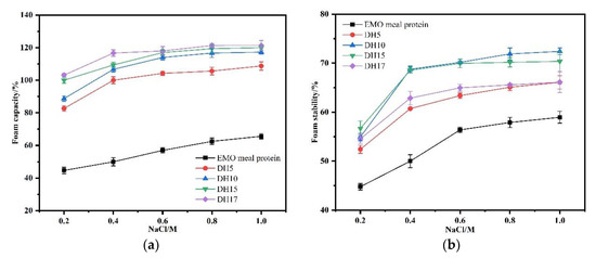 As shown in Figure 9a,b, the effect of NaCl concentration on the foaming properties of hydrolysates were in general similar to that of protein, the FC and FS increased when NaCl concentration increased from 0.2 to 0.6 mol/L, and then showed a slight change higher than 0.6 mol/L. The foaming properties of hydrolysates are significantly higher than that of protein, and the FC rose with increasing DH from 5 to 17. The highest value of FC was observed in DH17, but DH 10 showed a higher value of FS than the other hydrolysates. In fact, the effect of NaCl concentration on foaming properties can be attributed to two aspects: (I) NaCl concentration at low concentration can increase the solubility of protein, resulting in an improvement of foaming properties; (II) the concentration of NaCl concentration continued to increase, resulting in the salting out effect, which broke the protein bound and promoted the precipitation of protein. Therefore, the influence of NaCl concentration on foaming performance was mainly affected by the solubility of protein.