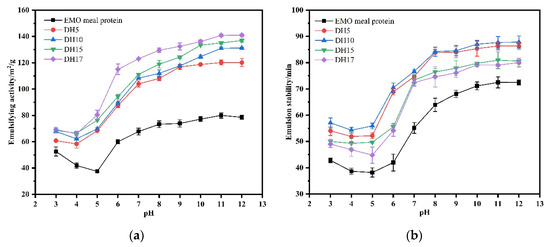 Effect of pH on emulsifying capacity (a) and emulsion stability (b) of the EMO meal protein and hydrolysates with different DH.