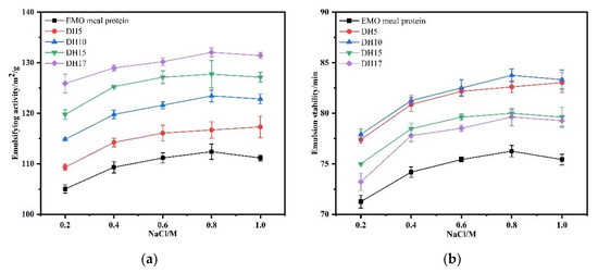 Effect of NaCl on emulsifying capacity (a) and emulsion stability (b) of the EMO meal protein and hydrolysates with different DH.