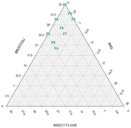 A three-factor simplex lattice design with three levels was used to formulate all the possible mixtures (9 assays) containing broccoli (BR), dried BSG and insect flour (IF), adding up to 35% of the total weight of the ingredients (Figure 1).