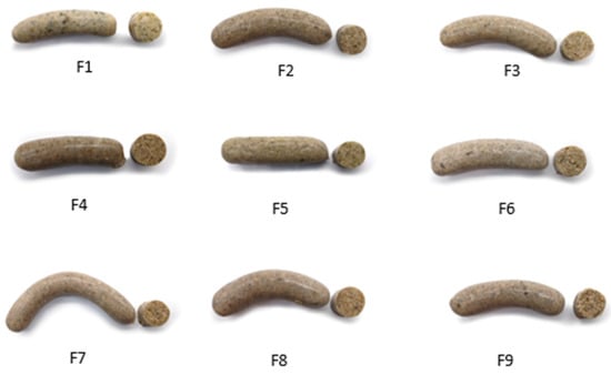 Images of the 9 hybrid sausages used in the experiments. The samples, labelled from F1 to F9, contain different percentages of broccoli, upcycled brewer’s spent grain and insect flour (BR, BSG, IF): F1 (35, 0, 0), F2 (30, 5, 0), F3 (25, 0, 1), F4 (20, 5, 10), F5 (30, 0, 5), F6 (32, 3, 0), F7 (25, 5, 5), F8 (22, 3, 10) and F9 (27, 3, 5).