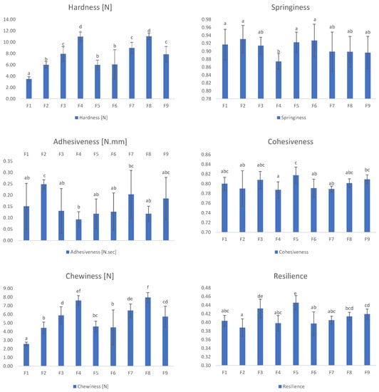 Texture Profile Analyses (TPA) of the 9 hybrid sausages used in the experiments. The samples, labelled from F1 to F9, contain different percentages of broccoli, upcycled brewer’s spent grain and insect flour (BR, BSG, IF): F1 (35, 0, 0), F2 (30, 5, 0), F3 (25, 0, 10), F4 (20, 5, 10), F5 (30, 0, 5), F6 (32, 3, 0), F7 (25, 5, 5), F8 (22, 3, 10) and F9 (27, 3, 5). Different letters in the same bar are significantly different according to Tukey’s test (p < 0.05).
