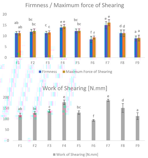 Shearing analysis revealed that the F4, F8 and F7 samples required significantly (p < 0.05) more work to shear than the rest of the samples (Figure 4). The sausages F4, F7 and F8 contained 15, 10 and 13% of dry ingredients, respectively, and they were harder and chewier than the others. Their relatively large work-of-shear values could also be related to an increased proportion of solid compounds. Augmenting the firmness of gels can raise the resistance to compression and shearing, explaining the results obtained in these tests.