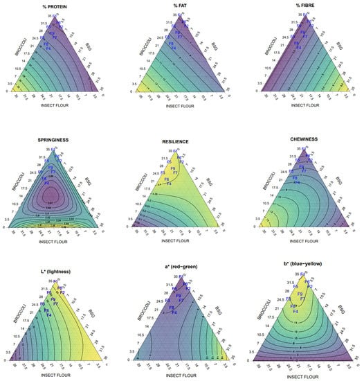 Ternary diagrams of the responses where R2 > 90%. The diagrams show the content of protein, fat and fibre content (percentage), the springiness, resilience and chewiness and the L*a*b* colour parameters. The samples, labelled from F1 to F9, contain different percentages of broccoli, upcycled brewer’s spent grain and insect flour (BR, BSG, IF): F1 (35, 0, 0), F2 (30, 5, 0), F3 (25, 0, 1), F4 (20, 5, 10), F5 (30, 0, 5), F6 (32, 3, 0), F7 (25, 5, 5), F8 (22, 3, 10) and F9 (27, 3, 5).