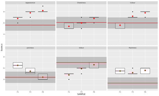 Boxplots for the attributes assessed for each sample (F1, F3 and F8) compared to the commercial sample QDA (horizontal red line). Dark grey area represents QDA values ± 1. Red dots represent the average of each panellist; black dots represent the outliers.