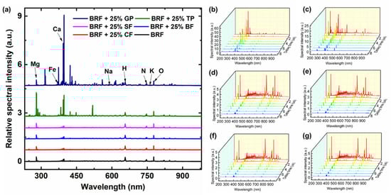(a) LIBS spectra and (b–g) time-resolved spectra of BRF with 25% GP, BRF with 25% TP, BRF with 25% SF, BRF with 25% BF, BRF with 25% CF and BRF, where the lines with different colors in (b–g) represent the spectra with different time delay.