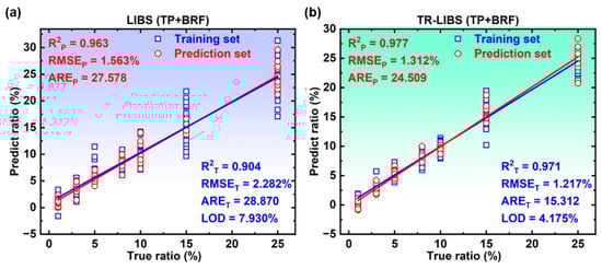 Linear fitting results of the PLSR model based on (a) LIBS and (b) TR-LIBS in the training set and prediction set of adulterant TP.