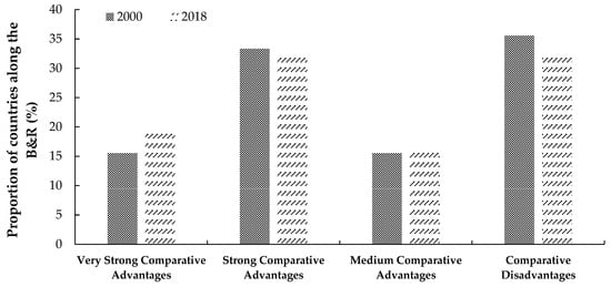 Based on Equation (1), we measured the comparative advantage of total agricultural trade in each country along the B&R in each year from 2000 to 2018, and then, according to the value classification proposed by Rodas-Martini [] and Long [], we drew the distribution of agricultural trade comparative advantage in 2000 and 2018, as shown in Figure 1. From 2000 to 2018, in 64 countries along the B&R, the total proportion of number of countries along the B&R with very strong, strong and medium comparative advantage increased from 64.4% to 68.0%, of which that with a very strong comparative advantage increased from 15.6% to 19.6%, while that with a comparative disadvantage decreased from 35.6% to 32.0%. Therefore, compared with the world average level, the comparative advantage of total agricultural trade in countries along the B&R totally strengthened during 2000–2018.