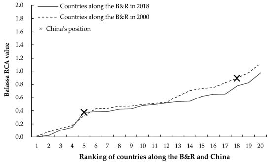 The Balassa RCA values of total agricultural trade in countries along the B&R and China in 2000 and 2018. The x-axis represents the ranking of countries along the B&R and China based on the Balassa RCA values in 2000 and 2018; and the y-axis represents the Balassa RCA value.