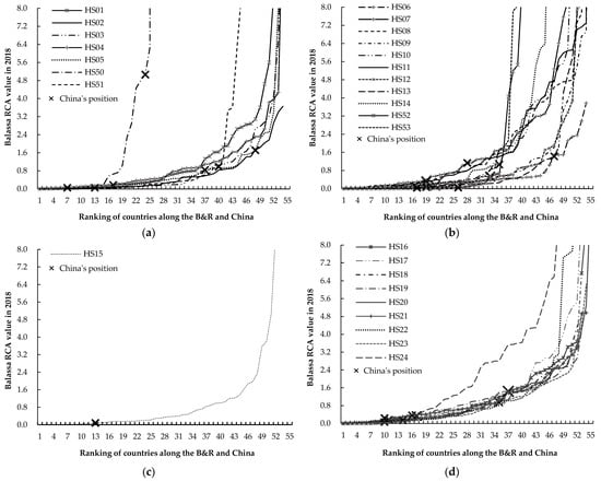The Balassa RCA values of 4 categories of agricultural products in countries along the B&R and China in 2018. (a)the first category of agricultural products (live animals and animal products, including HS01–HS05 and HS50–HS51); (b) the second category of agricultural products (plant products, including HS06–HS14 and HS52–HS53); (c) the third category of agricultural products (animal and vegetable oils and fats, including HS15); (d) the fourth category of agricultural products (food, beverages and tobacco, including HS16–HS24). The x-axis represents the ranking of countries along the B&R and China based on the Balassa RCA values in 2018; and the y-axis represents the Balassa RCA value.