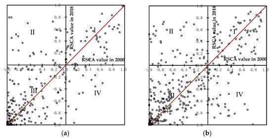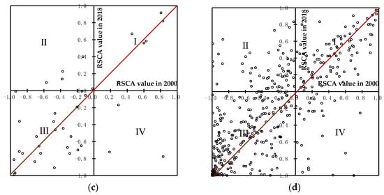 Based on the measurement results of 4 categories of agricultural products in countries along the B&R in 2000 and 2018 by using the RSCA index, the changes in the RSCA values were presented in Figure 4. The x-axis and y-axis represent the zero values of the RSCA index in 2018 and 2000, respectively, and divide the coordinate series into 4 quadrants, reflecting 4 different combinations of the RSCA values in 2000 and 2018. Points in the quadrant I indicate the maintenance of the initial comparative advantage, points in the quadrant II indicate the acquisition of a new comparative advantage, points in the quadrant III indicate the maintenance of the initial comparative disadvantage, and points in the quadrant IV indicate the deterioration of the initial comparative advantage.