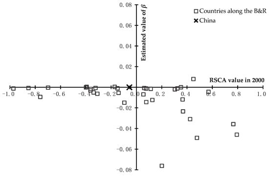 The mean annual change pace of the RSCA values of total agricultural products in countries along the B&R and China from 2000 to 2018. The x-axis represents the RSCA value in 2000; and the y-axis represents the estimated value of . is supposed to reveal an increase in comparative advantage from 2000 to 2018, and is supposed to reveal a decrease in comparative advantage from 2000 to 2018.