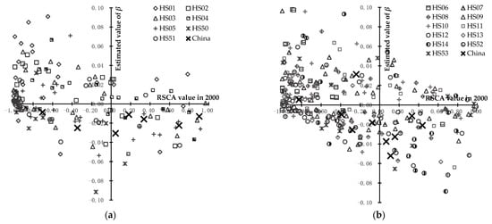 Therefore, the comparative advantage of agricultural trade in countries along the B&R and China had significant varieties differences, and in total, that in countries along the B&R was stronger than China, which is consistent with previous studies [,,,]. The comparative advantage of most agricultural products at the HS 2-digit level in countries along the B&R and China deteriorated, simultaneously, while the comparative disadvantage of some agricultural products at the HS 2-digit level in countries along the B&R improved. The main agricultural products exported respectively by countries along the B&R and China were just the agricultural products with comparative advantage, which verified that the product structure of agricultural trade between the two sides was in line with each other’s comparative advantage and had strong complementary, indirectly proving the validity of the Heckscher–Ohlin theorem.
