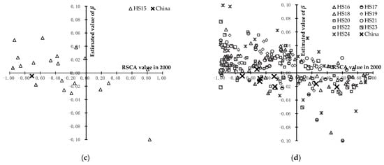 The mean annual change pace of the RSCA values of 4 categories of agricultural products in countries along the B&R and China from 2000 to 2018. (a) the first category of agricultural products (live animals and animal products, including HS01–HS05 and HS50–HS51); (b) the second category of agricultural products (plant products, including HS06–HS14 and HS52–HS53); (c) the third category of agricultural products (animal and vegetable oils and fats, including HS15); (d) the fourth category of agricultural products (food, beverages and tobacco, including HS16–HS24). The x-axis represents the RSCA value in 2000; and the y-axis represents the estimated value of . is supposed to reveal an increase in comparative advantage from 2000 to 2018, and is supposed to reveal a decrease in comparative advantage from 2000 to 2018.