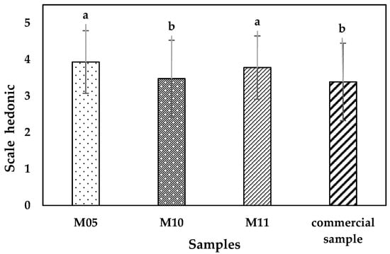 | Attributes | p-Value | M11-284 (90% Quinoa and 10% Lupine) | Commercial Sample 343 | M10-459 (33.33% Quinoa, Corn and Lupine) | M05-625 (50% Quinoa and 50% Lupine) |