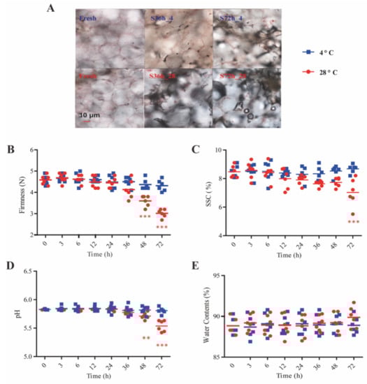 Changes in sensory qualities of watermelon pulps at different storage conditions: (A) cell morphology of pulps under microscope; (B) firmness; (C) soluble solid contents; (D) pH; (E) percentages of water contents in fresh-cut watermelons. Note: Star in red color means significant difference between the fresh cubes and cubes stored at 28 °C (**p < 0.01, ***p < 0.001 vs fresh group).