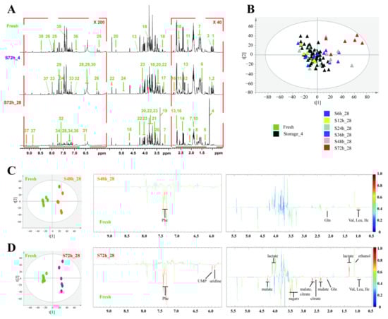 Changes in metabolic profiles of watermelon pulps at different storage conditions: (A) 1H NMR spectra of watermelon pulps extracts from fresh cubes and cubes stored for 72 h at 4 °C and 28 °C, respectively; (B) PCA score plot for watermelon samples that have been monitored at different storage periods and conditions; (C) score plot and loading plot of model constructed using fresh cubes and cubes stored at 28 °C for 48 h; (D) score plot and loading plot of model constructed using fresh cubes and cubes stored at 28 °C for 72 h. Note: Identified metabolites are listed in Table S2 with details.