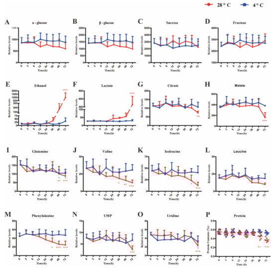 To determine the constituents that prominently affected the metabolic profiles of multivariate statistical models, the coefficient values of the first principal component in OPLS-DA were obtained for further analysis. As depicted in Figure 2C,D, glutamine, valine, leucine, isoleucine, and phenylalanine decreased evidently after 48 h storage at RT, and the tendency became more remarkable at 72 h. In addition, the contents of malate, citrate, uridine, and uridine 5-monophosphate (UMP) declined, while ethanol and lactate increased significantly, after 72 h storage at RT. Relative quantifications of the above components and soluble sugars were executed by manually integrating their characteristic signals in 1H NMR spectra. From the line charts (Figure 3), the variation trends of corresponding components during the whole storage period are comprehensible at a glance.
