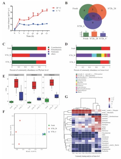 Changes in microbial communities of watermelon pulps at different storage conditions: (A) microbial population on watermelon cubes under different storage period and temperature; (B) Venn diagram representing the number of shared OTUs between groups Fresh, S72h_4, and S72h_28 using the full data set as well as the unique OTUs of each type of sample; (C) relative abundance of microbiota on Phylum level; (D) relative abundance of microbiota on Genus level; (E) α-diversity indices of microbiome of watermelon cubes from groups Fresh, S72h_4, and S72h_28; (F) principal co-ordinates analysis (PCoA) of samples from groups Fresh, S72h_4, and S72h_28; (G) community heatmap analysis of samples from groups Fresh, S72h_4, and S72h_28. Note: In figure (A,B,E,F), Fresh group is represented in green, S72h_28 group is represented in red, and S72h_4 group is represented in blue; * in figure E means p < 0.05 between groups Fresh and S72h_28.