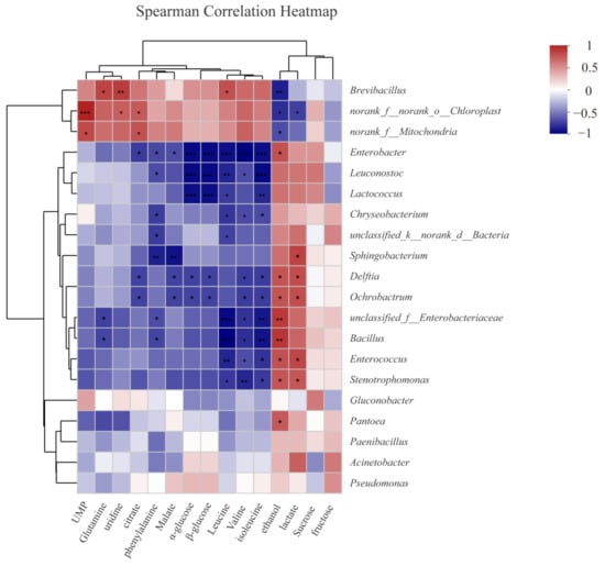 Heatmap of Spearman correlation analysis between the genera of microbiome in fresh-cut watermelons and the significantly changed metabolites in watermelon pulps. Note: Color in red means positive correlation between the genus and corresponding metabolite while blue means a negative correlation relationship; significance of correlation coefficient is denoted in star (* p < 0.05, ** p < 0.01, *** p < 0.001).