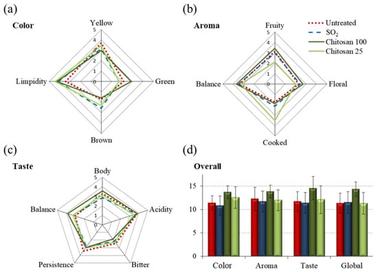 Descriptive sensory analysis of (a) color, (b) aroma, (c) taste and (d) overall global attributes evaluation of white wines. The wines were analyzed after 12 months of storage under the following conditions: without preservative treatment (red lines/bars), treated with SO2 (blue lines/bars), treated with 100 cm2 Ch-Ge films (Chitosan 100, dark green lines/bars) and with 25 cm2 Ch-Ge films (Chitosan 25, light green lines/bars).