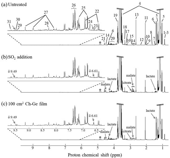 The 500 MHz 1H NMR average spectra of white wines varying in treatment strategy, as follows: (a) untreated, (b) treated with 40 mg/L of SO2 and (c) treated with 100 cm2 Ch-Ge films, with inset shown for the expanded aromatic region (6–10 ppm). Peak assignments: 1–3, higher alcohols (1: isobutanol; 2: 1-propanol; 3: isopentanol); 4, ethanol; 5, ethanol satellites; 6, lactate; 7, unassigned resonance at δ 1.46, doublet; 8, alanine; 9, proline; 10, ethyl acetate; 11, acetate; 12, pyruvate; 13, succinate; 14, malate; 15, citrate; 16, choline; 17, myo-inositol; 18, methanol; 19, glycerol; 20, sugar resonances (including glucose and fructose); 21, tartarate; 22, ferulate; 23, unassigned resonance at δ 6.61, doublet; 24, fumarate; 25, tyrosol; 26, phenylethanol; 27, trigonelline; 28, formate; 29, 5-hydroxymethyl furfural (5-HMF); 30, unassigned resonance at δ 9.49, singlet; 31, acetaldehyde. Visually identified spectral variations between the different treatment samples are highlighted by arrows and full metabolite names in (b) and (c) spectra: lactate (1.46 ppm and 4.32 ppm), malate (2.80 ppm and 4.50 ppm), citrate (2.93 ppm), unassigned at δ 6.61, doublet, and unassigned at δ 9.49, singlet. * Water suppression region.