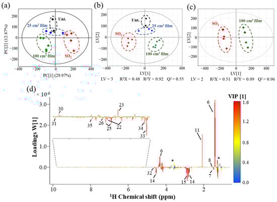 (a) PCA and (b) PLS-DA scores scatter plots obtained for all white wines 1H NMR spectra in the following conditions: untreated (Unt., black, n = 2), treated with 40 mg/L SO2 (SO2, red, n = 4) and treated with 25 cm2 (25 cm2 film, blue, n = 3) or 100 cm2 Ch-Ge films (100 cm2 film, green, n = 5); (c) pairwise PLS-DA scores scatter plot of wines treated with SO2 (red, n = 4) and 100 cm2 Ch-Ge films (green, n = 5); and (d) PLS-DA loading weights (W []) plot (colored according to the variable’s importance (VIP) of each data point) corresponding to the PLS-DA model shown in (c), where peak numbering corresponds to that shown in Figure 2 caption, with additional peak assignments as follows: 32, β-glucose (4.62 ppm,); 33, α-glucose (5.20 ppm); 34, turanose (5.30 ppm); and 35, uridine (7.87 ppm). Abbreviations: LV, latent variables. * Water suppression region.
