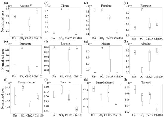Boxplots illustrating the variations in the levels of organic acids, amino acids and corresponding alcohols among the different conditions: untreated (Unt, n = 2), treated with 40 mg/L SO2 (n = 5) and treated with 25 cm2 (n = 3) and 100 cm2 Ch-Ge films (n = 4), Chit25 and Chit100, respectively. (a–g): organics acids—acetate, citrate, ferulate, formate, fumarate, lactate and malate; (h–l): amino acids and corresponding alcohols—alanine, phenylalanine, tyrosine, phenylethanol and tyrosol. # Acetate variation is possibly affected by residual amounts present in the films (use of acetic acid in the films’ preparation).