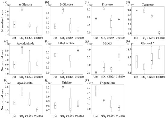 Boxplots illustrating the variations in the levels of sugars and other metabolites among the different conditions: untreated (Unt, n = 2), treated with 40 mg/L SO2 (n = 5) and treated with 25 cm2 (n = 3) or 100 cm2 Ch-Ge films (n = 4), Chit25 and Chit100, respectively. (a–d): sugars—α-glucose, β-glucose, fructose, turanose; (e–k): other metabolites—acetaldehyde, ethyl acetate, 5-hydroxymethylfurfural (5-HMF), glycerol, myo-inositol, uridine and trigonelline. # Glycerol variation is possibly affected by residual amounts present in the films (use of glycerol as a plasticizer in the films’ preparation).