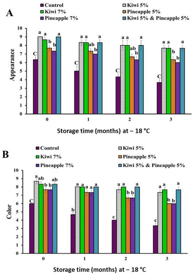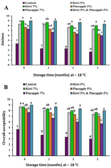 | Kiwi 5% and Pineapple 5% | 57.46 a ± 0.77 | 7.89 b ± 0.01 | 12.00 a ± 0.35 |
