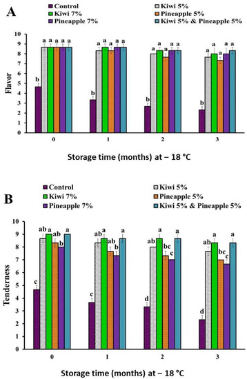 3.1.3. The Effect of Kiwi and Pineapple Extracts on the Sensory Attributes of Spent Hen Meat Patties