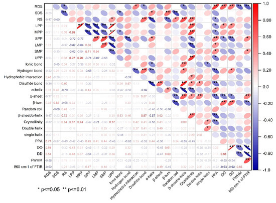 3.7. Correlationship between Starch Digestibility and the Structal Characteristics of Protein and Starch
