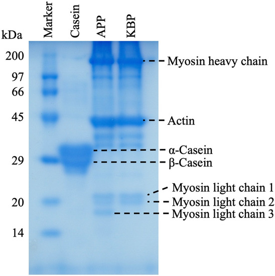 Figure 1 shows the protein band patterns of casein, APP, and KBP subjected to SDS-PAGE. The two prominent bands of casein at approximately 29 kDa represent α-casein and β-casein. Meanwhile, APP and KBP exhibited prominent bands at approximately 200 and 45 kDa, respectively, which are myofibrillar proteins containing myosin (heavy chain, approximately 200 kDa) and actin (approximately 45 kDa). Additionally, the band patterns of APP and KBP were similar, except for the lack of myosin light chain 3 in KBP.
