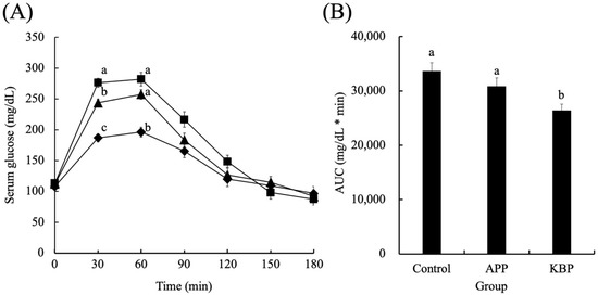 Serum glucose concentrations as a function of time (A) and area under the curve (B) during MTT. Control (■), APP (▲), and KBP (◆) groups. Data represent mean ± standard error from the data of 8 animals per group. Means were compared using analysis of variance, followed by Tukey’s multiple comparison test with a cut-off level of 0.05 probability of significance. Different letters of the same item indicate significant differences. APP, Alaska pollock protein; AUC, area under the curve; KBP, kamaboko protein; MTT, meal tolerance test.