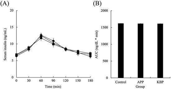 Figure 2 shows the serum glucose concentrations as a function of time during MTT in obese Zucker fa/fa rats fed on experimental diets. The fasting glucose concentrations were not significantly different between the groups before MTT, indicating that APP and KBP do not affect fasting glucose levels. After the start of MTT, the glucose concentration increased rapidly in all groups up to 30 min and peaked at 30 min. At 30 and 60 min, the glucose concentration in the KBP group was significantly lower than that in the control and APP groups. However, at 30 min, the glucose concentrations in all groups began to gradually decrease. The serum glucose concentration in the APP group at 30 min lower than that in the control group. From 30 min to 120 min, the serum glucose concentrations in the KBP group were lower than those in the control group. The glucose concentrations at 180 min were similar to those at the start of MTT. Additionally, the area under the curve of serum glucose concentration in the KBP group was significantly lower than that in the control and APP groups (Figure 2B).