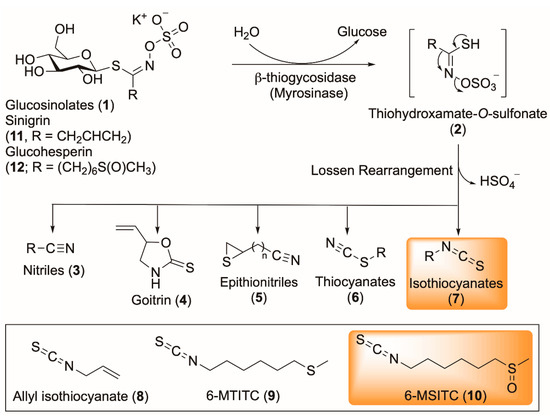 - Dinkova-Kostova, A.T.; Kostov, R.V. Glucosinolates and isothiocyanates in health and disease. Trends Mol. Med. 2012, 18, 337–347. [Google Scholar] [CrossRef]