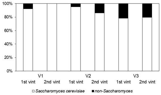 S. cerevisiae and non-Saccharomyces distribution across the vineyards (V1, V2, V3) and the first and second vintage (1st vint, 2nd vint).