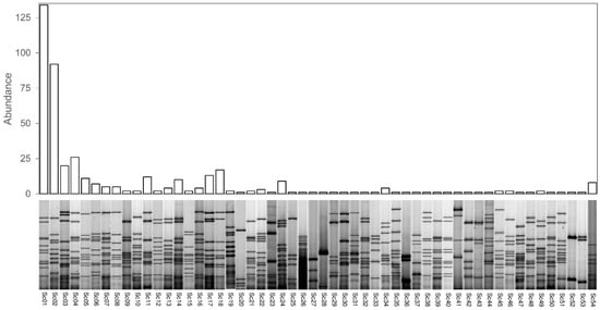In order to analyse the distribution of the S. cerevisiae populations, the Shannon index () was calculated [5,25]. This index allowed us to relate the number of different strains (richness, S) to the number of isolates belonging to each strain (relative abundance, ), estimating the diversity in the yeast communities (α diversity). Differences between the obtained Shannon index values were established by analysis of variance (ANOVA), and, when the differences were statistically significant, the Tukey’s test was calculated.