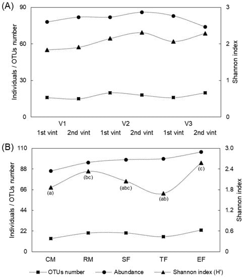 Geographical and temporal diversity of S. cerevisiae populations were determined according to total populations isolated from the vineyards (V1, V2 and V3) in both vintages. The Shannon index was calculated to estimate the diversity of S. cerevisiae populations found (α diversity) in each winemaking process [32,33]. The values obtained were compared by one-way ANOVA in order to determine differences between S. cerevisiae populations. Likewise, the sequential yeast populations found throughout the stages of alcoholic fermentation (CM, RM, SF, TF and EF) were evaluated (Figure 3).