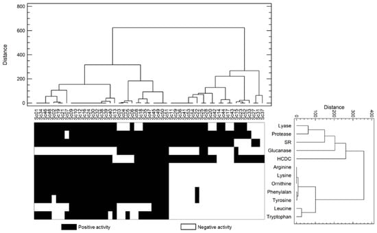 Enzymatic activities found in the representative isolates of each strain were represented by cluster analysis based on Ward´s method and squared Euclidean distances matrix. The isolates are grouped based on the positive or negative enzymatic activities shown. A dendrogram allows us to relate isolates with similar enzymatic activity profiles. The enzymatic activities determined in each isolate are represented by a heat map.