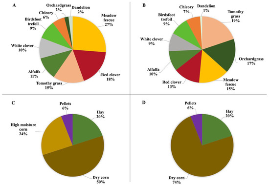 Botanical composition of the diets for 2019 and 2020. (A) 2019 GRASS, (B) 2020 GRASS, (C) 2019 GRAIN, (D) 2020 GRAIN. GRASS: complex pasture mixture; GRAIN: conventional grain diet (pellets contained 36% crude protein, hay was made of orchard grass).