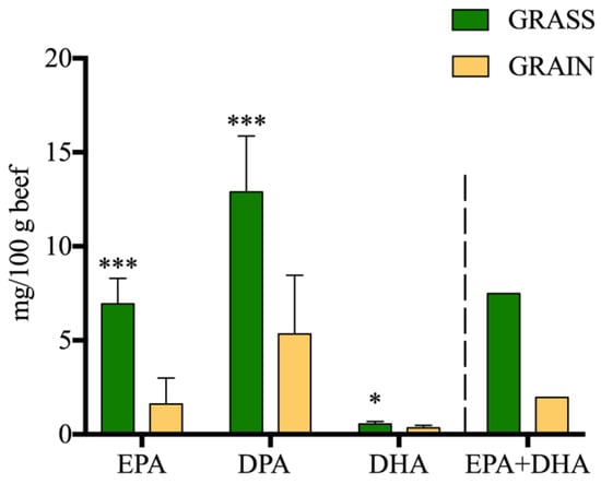 Long-chain n-3 PUFA content of beef (mg/100 g beef) by diet. EPA: eicosapentaenoic acid; DPA: n-3 docosapentaenoic acid; DHA: docosahexaenoic acid; EPA + DHA: sum of eicosapentaenoic acid and docosahexaenoic acid. ‘*’ denotes statistical significance (‘*’ p < 0.05, ‘***’ p < 0.001).