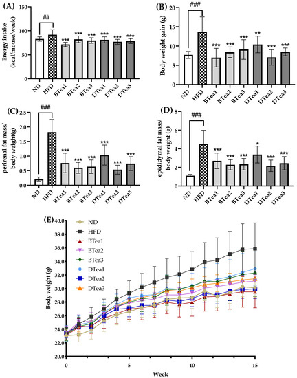 The effects of different black and dark teas on obesity. (A) Energy intake, (B) body weight gain, (C) the ratio of perirenal fat mass to body weight, (D) the ratio of epididymal fat mass to body weight, (E) and body weight throughout the 15-week intervention. The results are expressed as mean ± standard deviation. ND, the control group (normal diet group); HFD, the model group (high-fat diet group); BTea1, selenium-enriched black tea; BTea2, Dianhong tea; BTea3, Yingde Black tea; DTea1, Fu Brick Tea; DTea2, Liupao tea; DTea3, selenium-enriched dark tea. ## p < 0.01 and ### p < 0.001f for the HFD group, compared with the ND group; * p < 0.05, ** p < 0.01, *** p < 0.001, the tea extract supplementary groups compared with the HFD group.