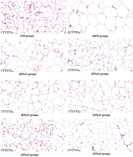 The histopathological changes in epididymal adipose tissue stained with hematoxylin and eosin (H&E) for all groups (magnification: 200, scale bar: 100 µm). ND, the control group (normal diet group); HFD, the model group (high-fat diet group); BTea1, selenium-enriched black tea; BTea2, Dianhong tea; BTea3, Yingde black tea; DTea1, Fu brick tea; DTea2, Liupao tea; DTea3, selenium-enriched dark tea.