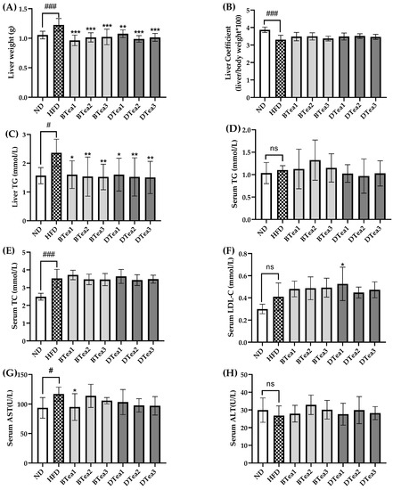The effects of different black and dark teas on the features related to NAFLD. (A) Liver weight; (B) liver coefficient; (C) liver triacylglycerol level (Liver TG); (D) serum triacylglycerol level (Serum TG); (E) serum total cholesterol level (Serum TC); (F) serum low-density lipoprotein cholesterol level (Serum LDL-C); (G) serum aspartate transaminase (Serum AST); (H) serum alanine aminotransferase (Serum ALT). The results are expressed as mean ± standard deviation. ND, the control group (normal diet group); HFD, the model group (high-fat diet group); BTea1, selenium-enriched black tea; BTea2, Dianhong tea; BTea3, Yingde black tea; DTea1, Fu brick tea; DTea2, Liupao tea; DTea3, selenium-enriched dark tea. # p < 0.05, ### p < 0.001, the HFD group compared with the ND group; * p < 0.05, ** p < 0.01, *** p < 0.001, the tea extract supplementary groups compared with the HFD group. ns, no statistically significant differences (p > 0.05) between the model group and the control group.